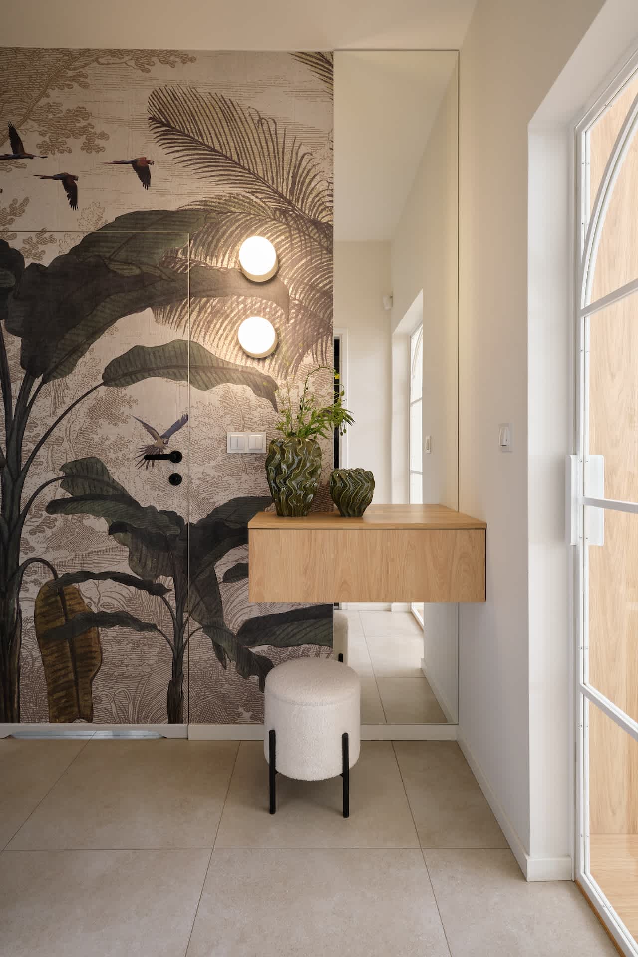 Mimo, że tapety naścienne kojarzą się nam na ogół raczej z pałacowym przepychem i maksymalizmem, odpowiednio dobrany wzór i kolorystyka mogą dookreślić to, czym japandi jest, a także zindywidualizować wnętrza. W tym wypadku kolor zielony liści odnosi do zewnętrza, przyrody, oraz koloru obecnego w łazience, a rysunek tapety jest subtelny i odznacza się wyraźnym konturem, niczym w dawnych japońskich grafikach. Sama tapeta „ukrywa” drzwi, co tworzy kolejną „jednolitą” płaszczyznę. Oczyszcza to widok mieszkania ze zbędnych linii i powoduje poczucie przestronności.