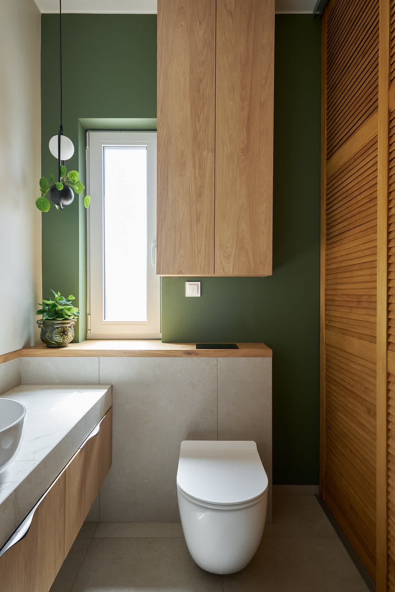W łazience pion i poziom zostały zbalansowane, ściany urozmaicone są poprzez kolor zielony jednej z nich. Akcent japoński pojawia się w postaci ażurowych drzwi, które mogą przywodzić na myśl także parawan. Mnogość drewna w relacji do zieleni ściany odnosi do natury i tworzy harmonijne wnętrze.