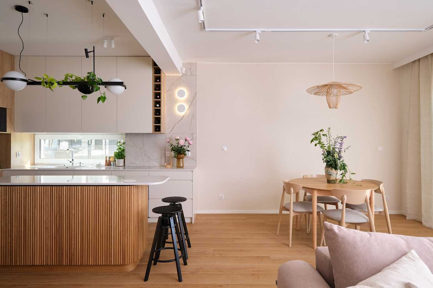 Pierwsze zdjęcie, dokumentujące projekt wrocławskiego mieszkania w stylu japandi, pozwala zauważyć, że węzłowym elementem we wnętrzu okazują się naturalne materiały, zwłaszcza te, których kolor przypomina nieobrobione, surowe drewno. Wśród istotnych materiałów jest też rattan i bambus. Obecność jasnego drewna i pastelowy odcień ścian powodują, że wnętrze jest jasne, czyste, spojrzenie niezakłócone. Paleta kolorystyczna w stylu japandi ogranicza się na ogół do beżu, brązu, odcieni ziemi, cegły, zieleni i… czerni. Czerń jest jednak jedynie akcentem. Tutaj pojawia się ona jako drobne dodatki, np. taborety, czy elementy lamp. Kolor ten pożyczony został z wnętrz japońskich, a także samej sztuki japońskiej (grafiki japońskie wykonywane tuszem, czy obrazy, na których to, co przedstawione, zazwyczaj obwiedzione jest nieistniejącym w naturze czarnym konturem). Jeśli chodzi o oświetlenie, w stylu japandi sprawdzą się papierowe abażury w formie kuli, lub – tak jak widzimy na drugim zdjęciu – lampy ażurowe, plecione, przypominające formą czapki kulszowe czy japońskie kapelusze ogrodowe. Samych dekoracji jest niewiele – te kilka ozdób, które odnoszą do naszych zainteresowań, podróży i są dla nas wyjątkowo wartościowe, zyskują właściwy wymiar i widoczność właśnie dzięki umiarowi.