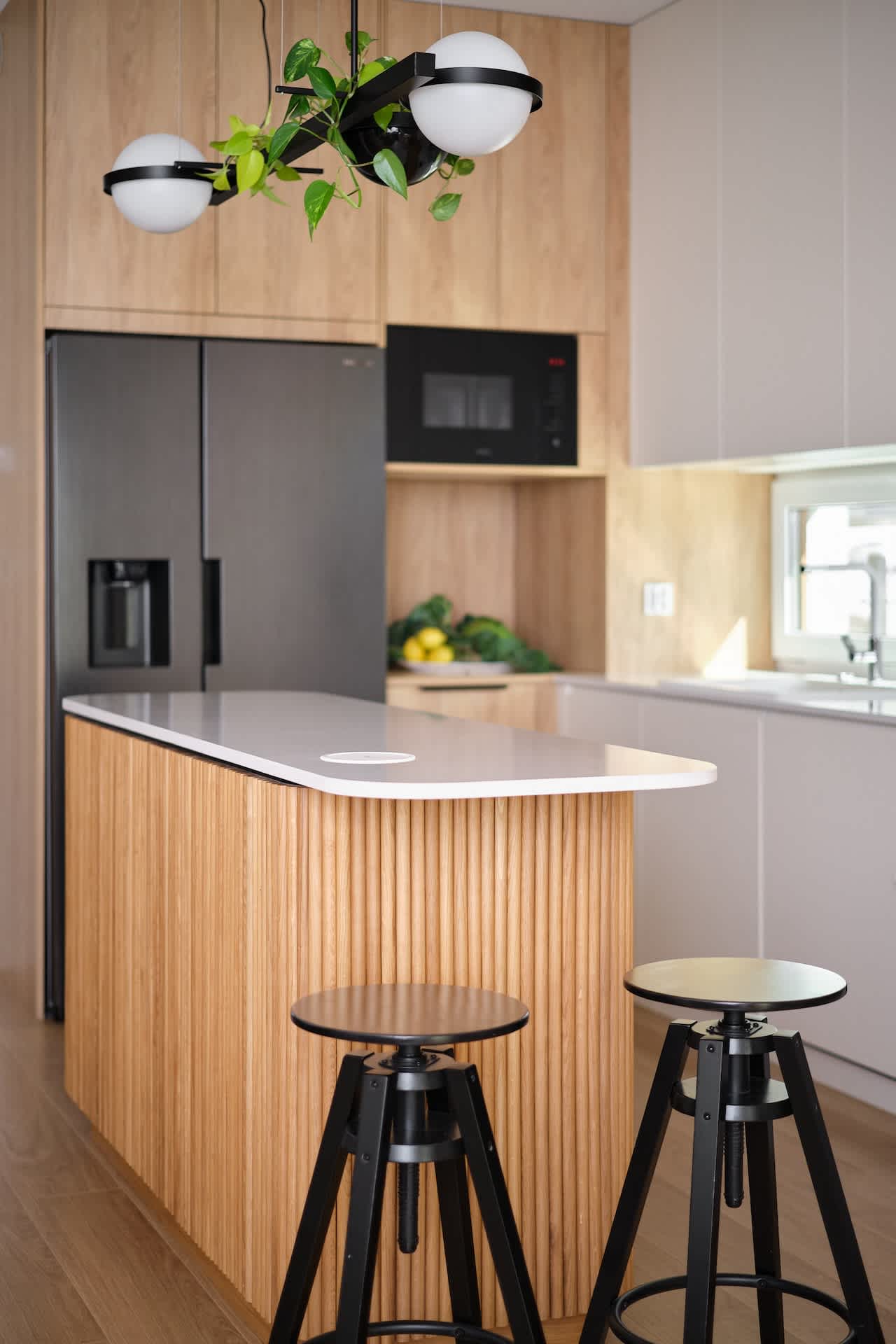 Dla stylu japońskiego charakterystyczne są także drewniane podziały ścian, tekstura drewna na ścianach, drewniane panele, tzw. shoji screens – dlatego dobrym pomysłem jest płaszczyznowe potraktowanie przestrzeni i np. jednolita, wysoka zabudowa kuchni. Świetnie sprawdzą się też popularne obecnie lamele – drewniane listwy, które służą do dekoracji ścian czy mebli. Wyspa kuchenna zyskuje dzięki zastosowanym tu listwom na lekkości, ale również przez zaokrąglenie krawędzi, co zgodne jest z zasadą feng shui, wedle której ostre krawędzie zastępujemy łagodnymi, a w końcu i dzięki białemu blatowi, pasującemu do dającej oddech bieli drugiej ściany kuchni (biel wiązana jest z kolei ze stylem skandynawskim).